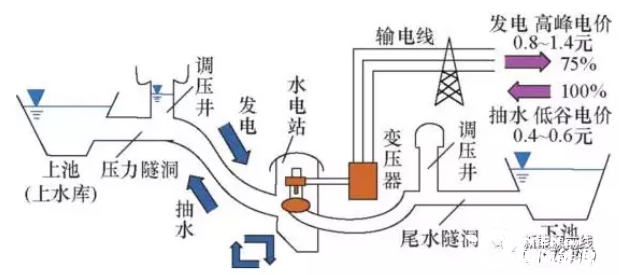 電網(wǎng)低谷時利用過剩電力將作為液態(tài)能量媒體的水從低標(biāo)高的水庫抽到高標(biāo)高的水庫,電網(wǎng)峰荷時高標(biāo)高水庫中的水回流到下水庫推動水輪機發(fā)電機發(fā)電。