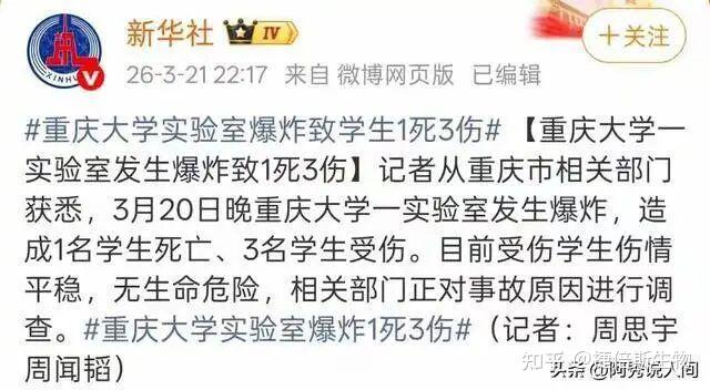 3月20日晚7點,重慶大學(xué)科學(xué)城校區(qū)的一個實驗室突然爆炸。當(dāng)時有四名學(xué)生在里面做實驗,爆炸發(fā)生后一名學(xué)生當(dāng)場死亡三人受傷,現(xiàn)場儀器碎了一地,地上還有血跡。