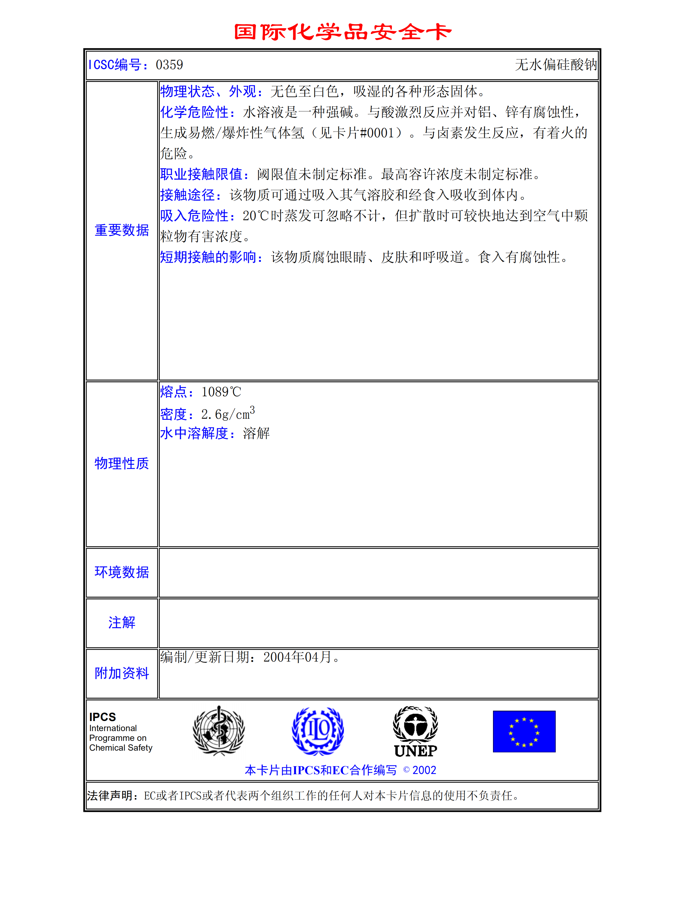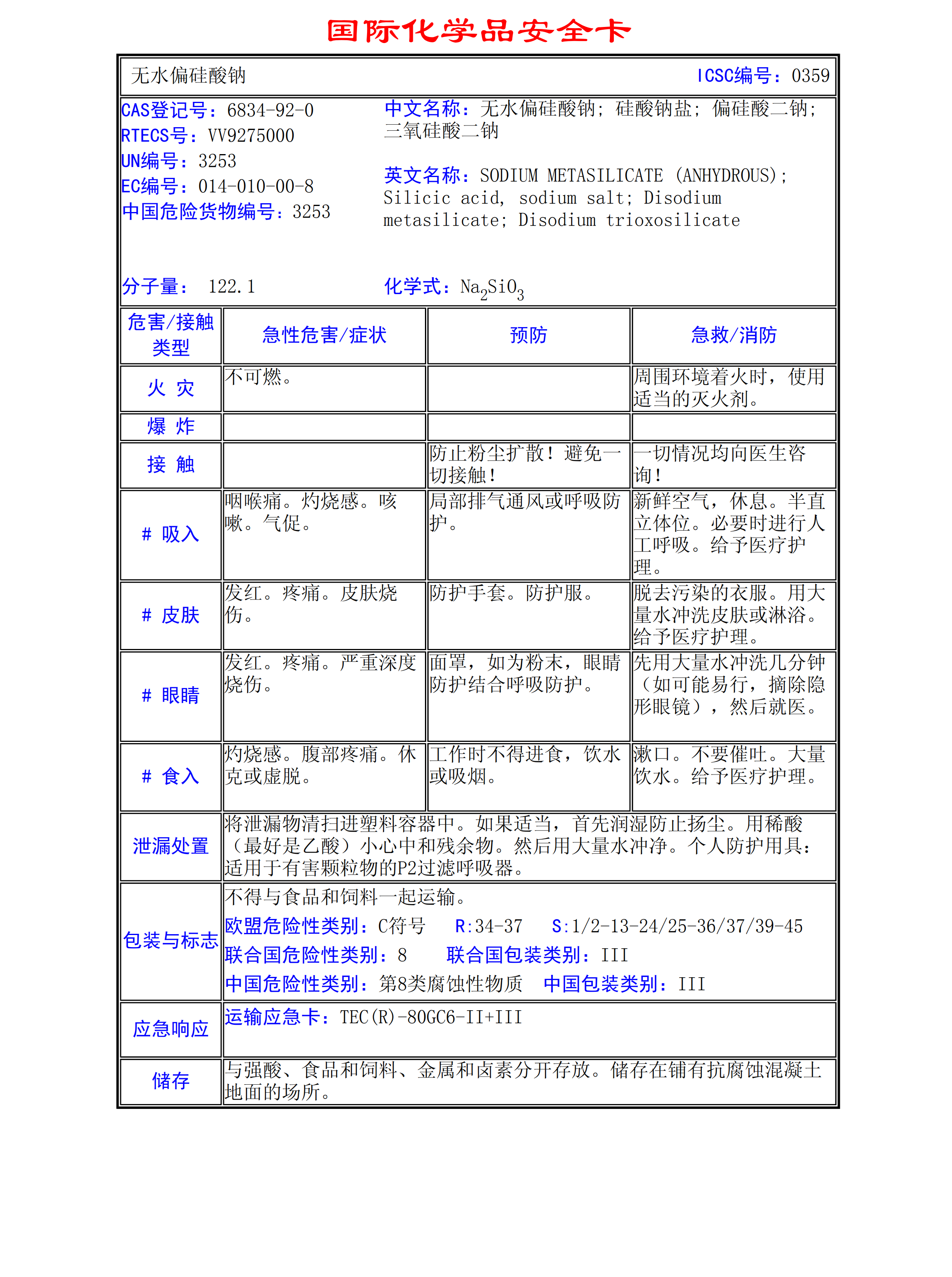無水偏硅酸鈉MSDS