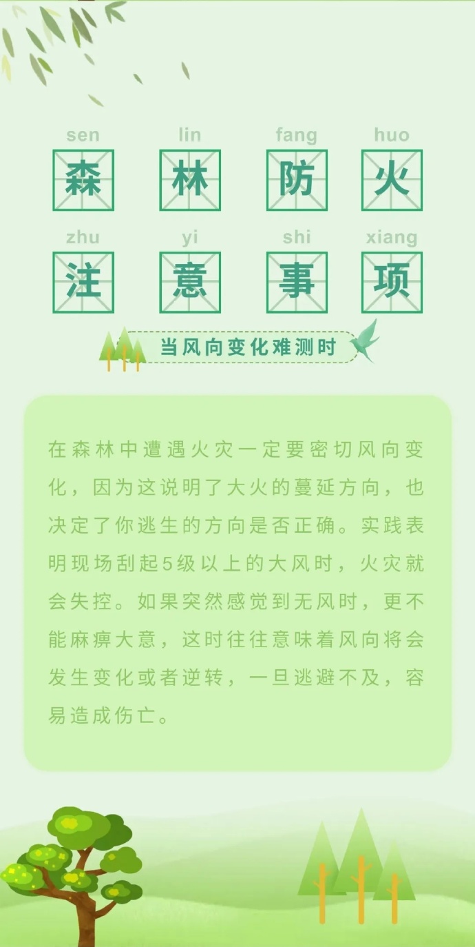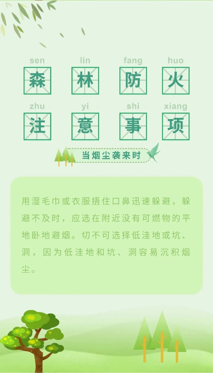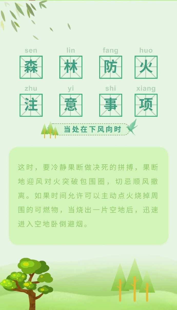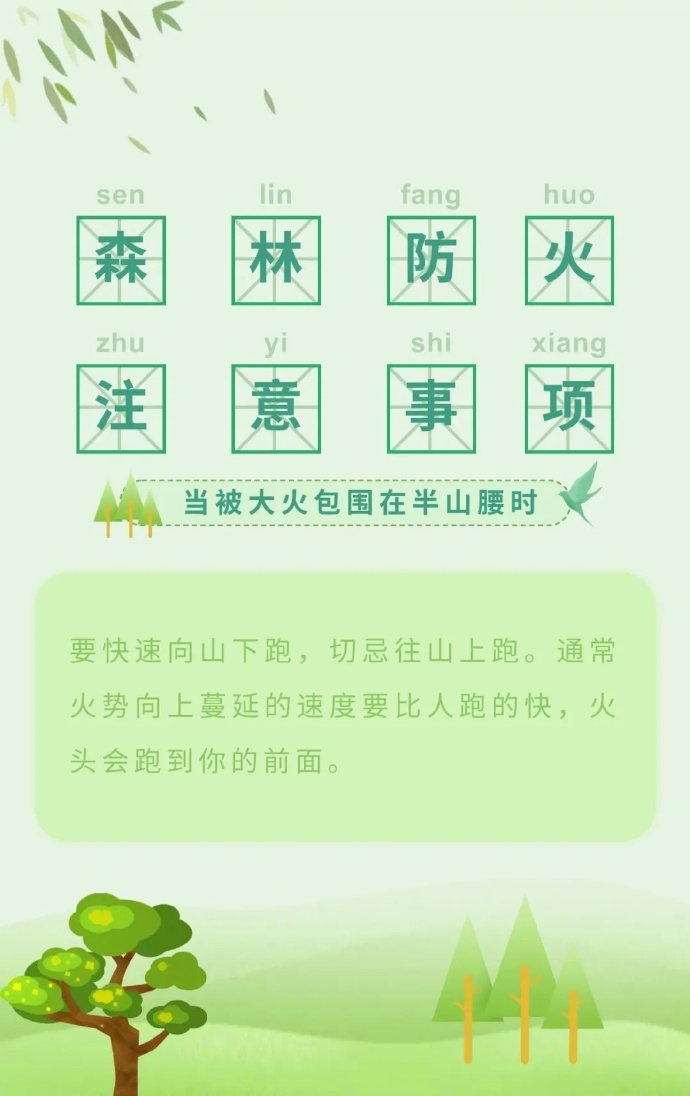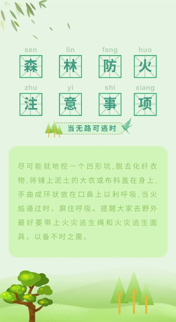 步入三月份以來,全國各地氣溫回升,物種植被干燥,火險(xiǎn)等級逐步升高,給森林防火滅火帶來嚴(yán)峻考驗(yàn)。那么,普通群眾遇到森林火災(zāi)時(shí),該如何最大限度的減小森林火災(zāi)對自身的危害呢?這些森林火災(zāi)基本逃生方法,一定要記住哦?。ǜ拭C省森林消防總隊(duì)平?jīng)鲋ш?duì)駐黃陵分隊(duì):倪騰飛)