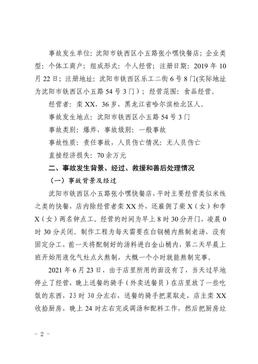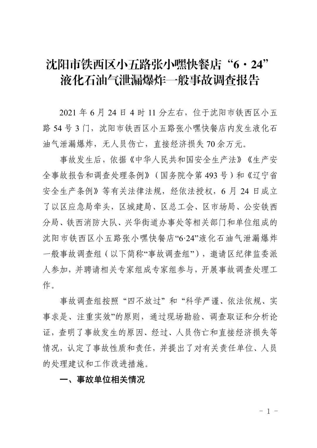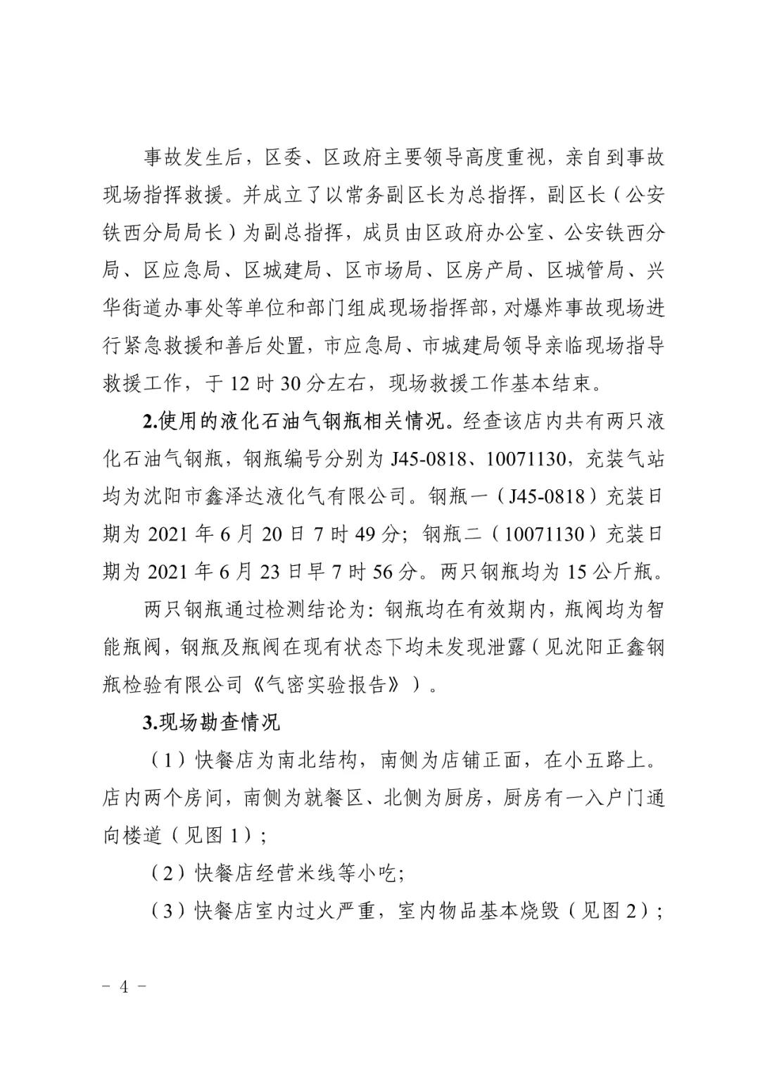 2021 年 6 月 24 日 4 時(shí) 11 分左右,位于沈陽(yáng)市鐵西區(qū)小五路 54 號(hào) 3 門,沈陽(yáng)市鐵西區(qū)小五路張小嘿快餐店內(nèi)發(fā)生液化石油氣泄漏爆炸,無(wú)人員傷亡,直接經(jīng)濟(jì)損失 70 余萬(wàn)元。
