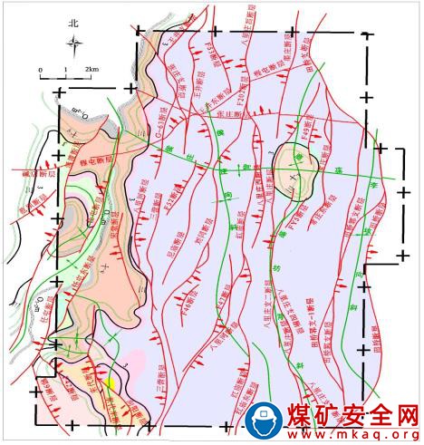 山東龍鄆煤業(yè)有限公司前身為山東省鄆城煤礦,位于菏澤市鄆城縣潘渡鎮(zhèn)境內(nèi),南距鄆城縣城 6 千米。原隸屬于山東省齊魯新航集團(tuán)有限責(zé)任公司,2006 年 9 月開工建設(shè)。2011 年 1 月起,山東省鄆城煤礦由龍礦集團(tuán)托管。2016 年 6 月,龍礦集團(tuán)與山東省齊魯新航集團(tuán)有限責(zé)任公司簽訂了《山東省鄆城煤礦移交接管劃轉(zhuǎn)協(xié)議》,礦井的生產(chǎn)建設(shè)主體變更為龍礦集團(tuán)。2017 年 4 月,礦井正式投產(chǎn),設(shè)計(jì)生產(chǎn)能力 240 萬噸/年。2017 年 12 月,礦井更名為山東龍鄆煤業(yè)有限公司(以下簡稱龍鄆煤礦)。2017 年 5~12 月,生產(chǎn)原煤 160 萬噸;2018 年 1~9 月,生產(chǎn)原煤 177.73萬噸。礦井采礦許可證、安全生產(chǎn)許可證、工商營業(yè)執(zhí)照齊全有效。礦井開采條件。井田位于巨野煤田最北端,屬全隱蔽的華北型石炭、二疊系煤田。井田范圍由 20 個(gè)拐點(diǎn)坐標(biāo)圈定,面積 198.3 平方公里,開采標(biāo)高-450~-1750 米。井田含煤地層為山西組和太原組,其中主采煤層為山西組 3 煤層。井田處于鄆城斷裂、巨野斷裂、曹縣斷裂和汶泗斷裂的“井”字形中間區(qū)內(nèi),井田的典型構(gòu)造特征為斷塊型。井田總體呈走向近南北、傾向東的單斜構(gòu)造,勘查發(fā)現(xiàn)全井田共有斷層 130 條,其中,一采區(qū) 37 條。見圖 1。