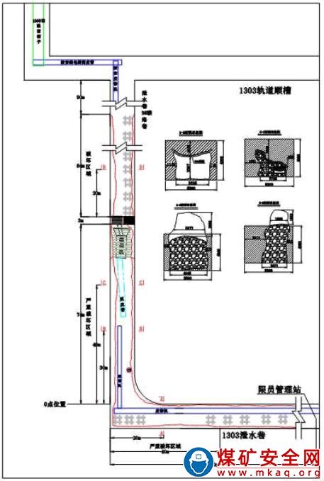 圖 6 事故區(qū)域位置及現(xiàn)場(chǎng)巷道破壞素描圖