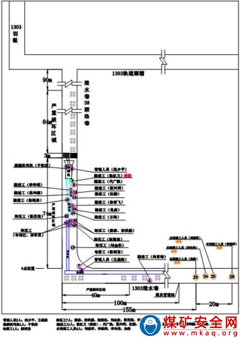 《沖擊危險(xiǎn)區(qū)封閉、準(zhǔn)入及限員制度》和《1303 工作面泄水巷掘進(jìn)工作面作業(yè)規(guī)程》規(guī)定:“掘進(jìn)工作面割煤期間及割煤后15 分鐘內(nèi),迎頭往外 50 米范圍以內(nèi),除掘進(jìn)機(jī)司機(jī)、掘進(jìn)機(jī)二運(yùn)轉(zhuǎn)載機(jī)看護(hù)人員外,嚴(yán)禁無關(guān)人員在此處逗留,并在進(jìn)入工作面迎頭向外 150 米處懸掛‘沖擊危險(xiǎn)區(qū)域、嚴(yán)禁人員進(jìn)入’牌板,設(shè)置限員準(zhǔn)入管理站,警戒區(qū)域內(nèi)作業(yè)人員不得超過 26 人”。限員管理站設(shè)置在拐點(diǎn)以外 100 米處,距迎頭 174 米,管理站放置 10 件防沖服。事故發(fā)生時(shí),管理站以里有 24 人。見圖 3。