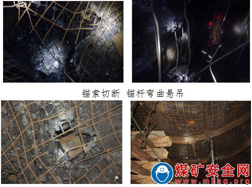 拉伸頸縮,表明巷道破壞瞬間錨桿、錨索承受了水平載荷作用,頂部煤體在水平?jīng)_擊載荷作用下發(fā)生碎脹變形,可以推斷頂煤冒落的主要原因是在破壞瞬間,巷道頂部煤體在沖擊載荷作用下發(fā)生碎脹變形,導(dǎo)致錨桿、錨索無法對(duì)其進(jìn)行有效約束。