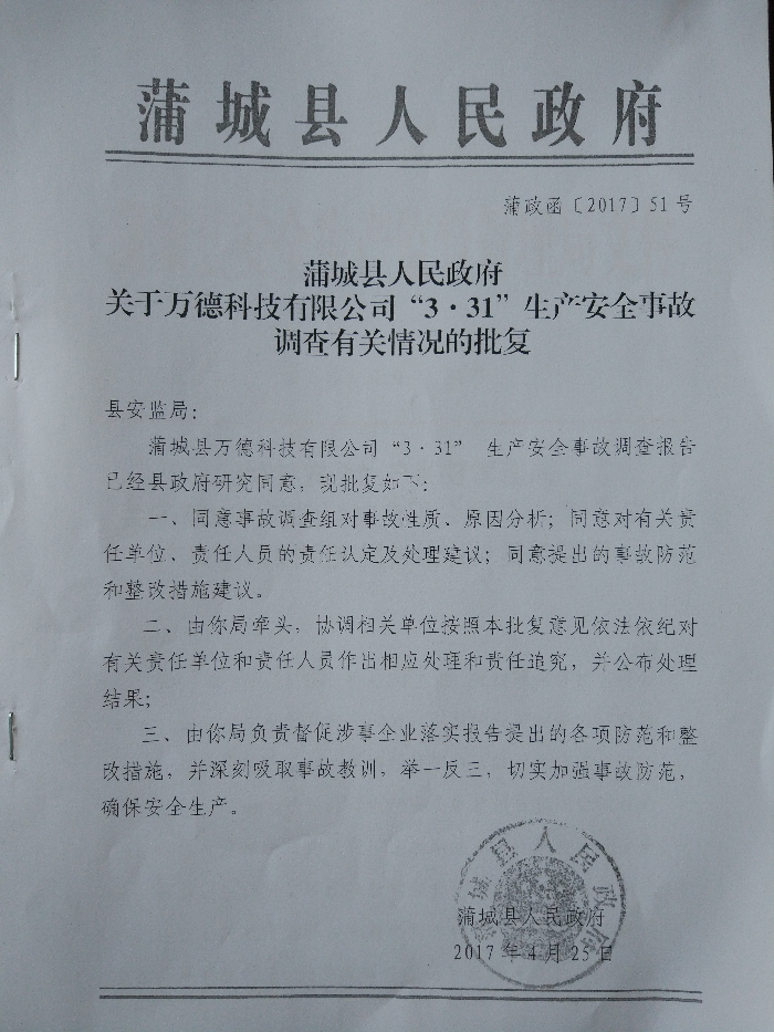 2、對本起事故主體責(zé)任單位蒲城萬德科技有限公司,依據(jù)《安全生產(chǎn)法》第一百零九條第一款,建議處以五十萬元的罰款。