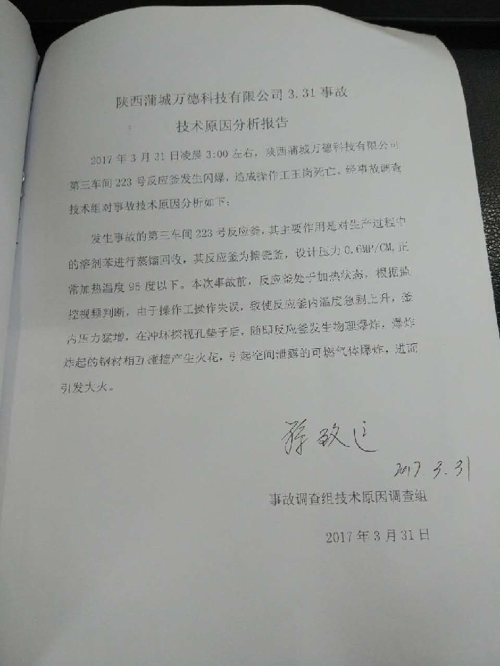 2017年3月31日凌晨3:00左右,蒲城萬德科技有限公司第三車間223反應(yīng)釜發(fā)生閃爆,引發(fā)第三車間著火,造成一起1名夜班工人死亡。依據(jù)《安全生產(chǎn)法》、《生產(chǎn)安全事故報(bào)告和調(diào)查處理?xiàng)l例》等法律法規(guī)的規(guī)定,縣政府成立了蒲城萬德科技有限公司“3.31”生產(chǎn)安全事故調(diào)查組開展事故調(diào)查。并聘請了相關(guān)?;瘜<覅⑴c調(diào)查。調(diào)查組經(jīng)過現(xiàn)場勘查、調(diào)查取證、專家論證和綜合分析,查明了事故發(fā)生的經(jīng)過、原因、人員傷亡和直接經(jīng)濟(jì)損失等情況,認(rèn)定了事故的性質(zhì)和責(zé)任,提出了事故防范及整頓措施的建議,現(xiàn)將事故調(diào)查報(bào)告如下:
