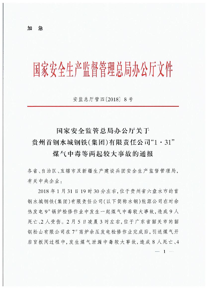 貴州首鋼水城鋼鐵(集團)有限責任公司“1?31”煤氣中毒等兩起較大事故的通報