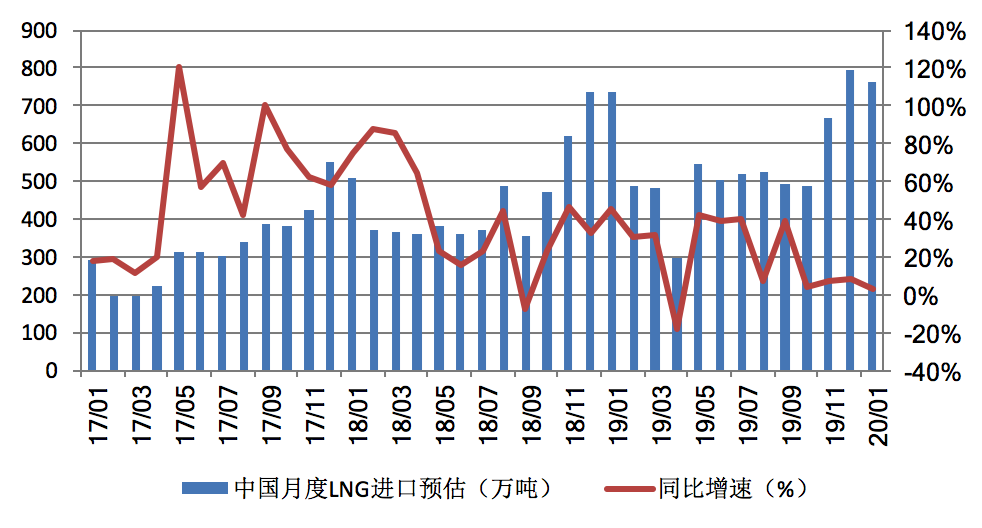 新華能源E-gas數(shù)據(jù)平臺的預(yù)測結(jié)果顯示,2020年1月份,中國LNG進(jìn)口量預(yù)計(jì)為763萬噸,較去年同期增長3.4%,較2019年12月減少3.9%。