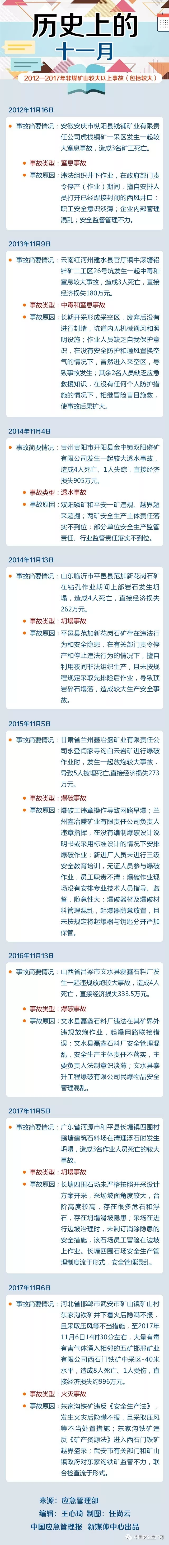 據不完全統(tǒng)計,2013年-2017年11月非煤礦山發(fā)生較大以上事故(包括較大)8起,中毒和窒息、坍塌、爆破三類事故多發(fā)!