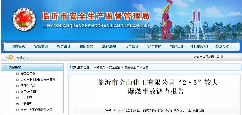 經(jīng)調(diào)查認(rèn)定,臨沂市金山化工有限公司“2.3”爆燃事故是一起較大生產(chǎn)安全責(zé)任事故。