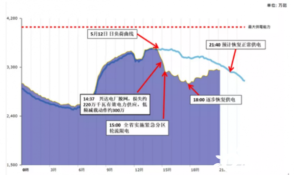 5月13日14時37分,興達(dá)電廠因接入345千伏路北變電站母線故障,導(dǎo)致電廠電力送出受阻,兩臺燃煤及兩臺燃?xì)鈾C(jī)組脫網(wǎng),系統(tǒng)損失有效電力供應(yīng)約220萬千瓦,造成臺灣系統(tǒng)頻率驟降,為維持電網(wǎng)穩(wěn)定,電力系統(tǒng)在第一時間自動啟動低頻卸載約300萬千瓦。臺電評估短時間內(nèi)無法立即復(fù)電,為維系電力系統(tǒng)安全,自下午3時起執(zhí)行緊急分區(qū)輪流停電,最大限電達(dá)到350萬千瓦。事故過程系統(tǒng)負(fù)荷變化曲線下圖所示。