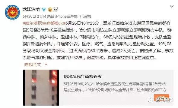 據(jù)@龍江消防:#哈爾濱民生尚都著火#5月26日18時(shí)23分,黑龍江省哈爾濱市道里區(qū)民生尚都祥園9號(hào)樓2單元16層發(fā)生爆炸,哈爾濱市消防支隊(duì)立即調(diào)派立即調(diào)派群力中隊(duì)、群西中隊(duì)、顧?quán)l(xiāng)中隊(duì)、愛建中隊(duì)17輛消防車、68名消防員趕赴現(xiàn)場(chǎng)撲救,支隊(duì)全勤指揮部遂行出動(dòng),并通知公安、醫(yī)療、燃?xì)狻?yīng)急局聯(lián)動(dòng)力量協(xié)助處置。19時(shí)05分現(xiàn)場(chǎng)明火被全部撲滅,過火面積約60平方米,造成2人死亡。據(jù)初步了解,事故系燃?xì)獗ㄒ稹T摻ㄖ?2層,鋼混結(jié)構(gòu)。