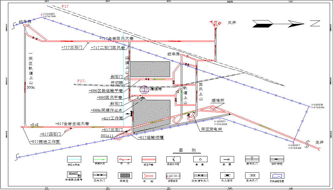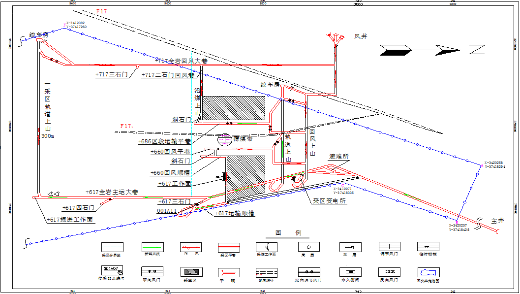 2.主要生產(chǎn)系統(tǒng)。礦井采用平硐上下山開拓,單水平布置。主平硐井口標(biāo)高+612.73m,副井井口標(biāo)高+761.70m,風(fēng)井井口標(biāo)高+758.94m。水平標(biāo)高為+617m,劃分為4個采區(qū)。其中,+617m水平以上設(shè)置Ⅰ、Ⅱ2個采區(qū),+617m水平以下設(shè)置Ⅲ、Ⅳ2個采區(qū)(見圖1)。礦井主平硐采用CTY2.5-GGB型蓄電池電機(jī)車運(yùn)輸;通風(fēng)方式為中央邊界抽出式通風(fēng),風(fēng)井安裝2臺FBCZ-6-№12防爆抽出式通風(fēng)機(jī),掘進(jìn)工作面采用局部通風(fēng)機(jī)供風(fēng);礦井為單回路供電,配備100KVA柴油發(fā)電機(jī)作為備用電源,電壓等級為660V。礦井現(xiàn)生產(chǎn)區(qū)域位于礦區(qū)中部F17斷層以南的Ⅰ采區(qū)。受斷層影響,Ⅰ采區(qū)北部呈一狹長塊段,礦井將該塊段劃分出來,作為邊角煤采區(qū)進(jìn)行獨(dú)立回采,即+617m采煤工作面,礦井編制了《邊角煤采區(qū)設(shè)計》。