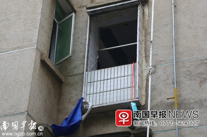 ▲爐灶因燃爆飛出窗戶,掛在窗臺上。 南國早報記者 鄒財麟攝