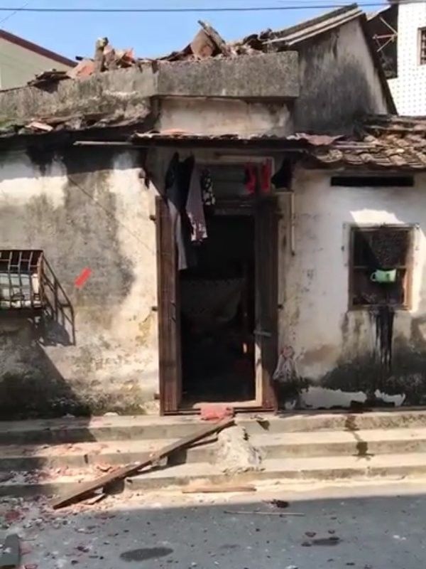 現(xiàn)場可以看到,該棟民宅的屋頂有四分之一的瓦片被毀,從隔壁的樓上往下看時,可以看見屋頂已經(jīng)出現(xiàn)一個大洞。
