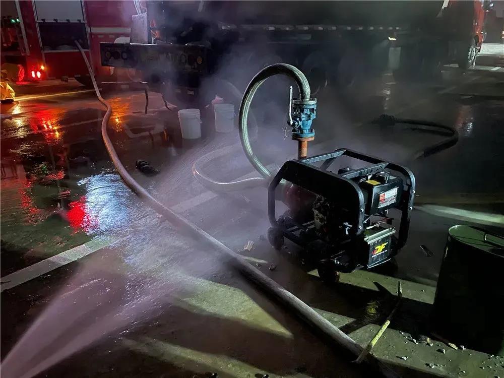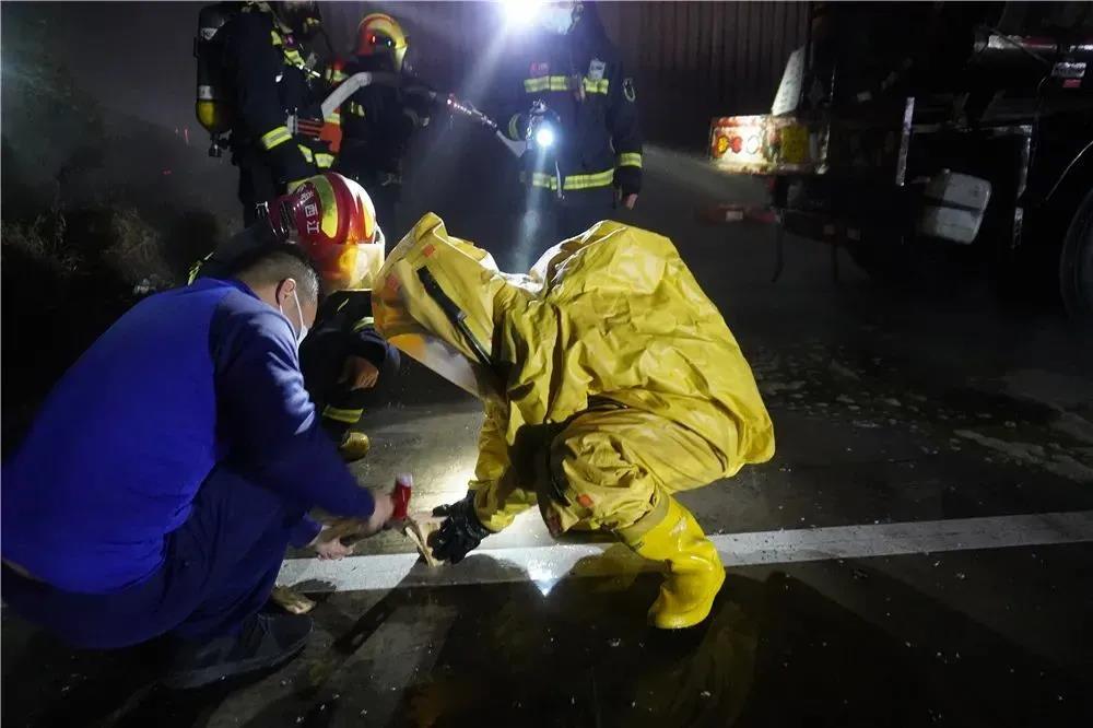 與此同時(shí),戰(zhàn)斗員穿戴好防化服,在水槍的掩護(hù)下帶著無火花快速堵漏器材靠近閥門實(shí)施堵漏作業(yè)。經(jīng)過47分鐘的努力,22時(shí)30分,堵漏成功,隨后前方指揮部安排儲(chǔ)罐車對(duì)泄露鹽酸車輛進(jìn)行倒罐處置。